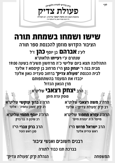 הציבור הקדוש מוזמן להכנסת ספר תורה תימני, שנכתב לע"נ אברהם בן יוסף כהן ז"ל, לבית המדרש לתורה ולתפילה "פעולת צדיק" בעיר אלעד. התהלוכה תצא ביום שלישי כ"ה מרחשון בשעה 19:00 מבית משפחת כהן רח' בן קיסמא 7 אלעד לבית הכנסת "פעולת צדיק" רח' סעדיה גאון. בהשתתפות מרן הגאון הגדול רבי יצחק רצאבי שליט"א - פוסק עדת תימן, ורבנים חשובים נוספים ואישי ציבור. ברוכים הבאים!