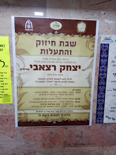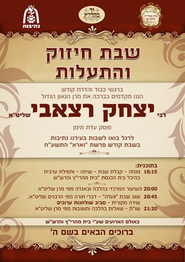 בית הכנסת ובית המדרש "בית מהרי"ץ והרש"ש" בעיר נתיבות מזמין את הציבור הרחב שוחרי התורה ולומדיה ל"שבת חיזוק והתעלות", בהשתתפות מרן הגאון הגדול רבי יצחק רצאבי שליט"א - פוסק עדת תימן, בשבת קודש פרשת וארא ה'תשע"ח. מצ"ב המודעה ותכנית השבת. ברוכים הבאים בשם ה'!