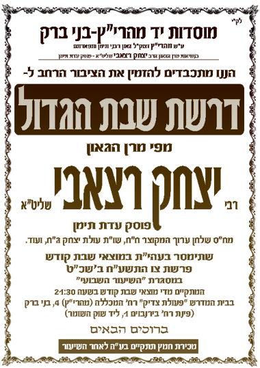 על פי הוראת מרן הגאון הרב יצחק רצאבי שליט"א וגדולי התורה והפוסקים, השימוש באינטרנט הינו לצורך בלבד, ובחיבור לאינטרנט כשר ומבוקר. כל חיבור אחר מהוה סכנה רוחנית וחינוכית.