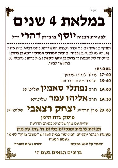 במלאת 4 שנים לפטירת המנוח יוסף בן צדוק דהרי ז"ל תתקיים אי"ה וב"נ אזכרה ועצרת התעוררות ביום רביעי כ"ה אלול בביה"כ ובית המדרש המרכזי "משכן צדוק" רחוב נחמיה 80 ראשון לציון. מצ"ב התכנית. בשעה 20:00 דרשת מרן הרה"ג יצחק רצאבי שליט"א - פוסק עדת תימן. שו"ת עם מרן שליט"א בסיום הדרשה, ולאחמ"כ תפילת ערבית. כיבוד קל יוגש במקום. עזרת נשים פתוחה. ברוכים הבאים בשם ה'.