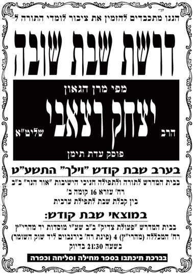 הננו מתכבדים להזמין את ציבור לומדי התורה ל"דרשות שבת שובה" מפי מרן הגאון רבי יצחק רצאבי שליט"א - פוסק עדת תימן. דרשת ליל שבת שובה תתקיים בעזהי"ת בבית הכנסת "אור הנר" רח' עזרא 16 - בני ברק, בין קבלת שבת לתפילת ערבית. דרשת שבת שובה המרכזית תתקיים במוצאי שבת במסגרת "השיעור השבועי" בבית המדרש פעולת צדיק ב"ב בשעה 21:30 בדיוק. ברוכים הבאים!
