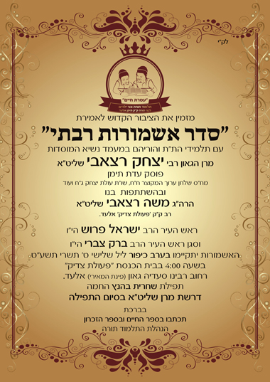 תלמוד תורה "עטרת חיים" לבני ק"ק תימן בעיר אלעד, מזמין את הציבור הקדוש לאמירת "אשמורות" עם ילדי הת"ת והוריהם, במעמד נשיא המוסדות מרן הגאון רבי יצחק רצאבי שליט"א, ובהשתתפות בנו הרה"ג משה רצאבי שליט"א רב קהילת "פעולת צדיק" - אלעד. האשמורות יתקיימו בערב יום הכיפורים - ליל שלישי, ט' תשרי התשע"ט בשעה 4:00 לפנות בוקר, בבית הכנסת "פעולת צדיק" רח' רבינו סעדיה גאון (פינת המאירי) אלעד. תפילת שחרית בהנץ החמה. דרשת מרן שליט"א בסיום התפילה. ברוכים הבאים!